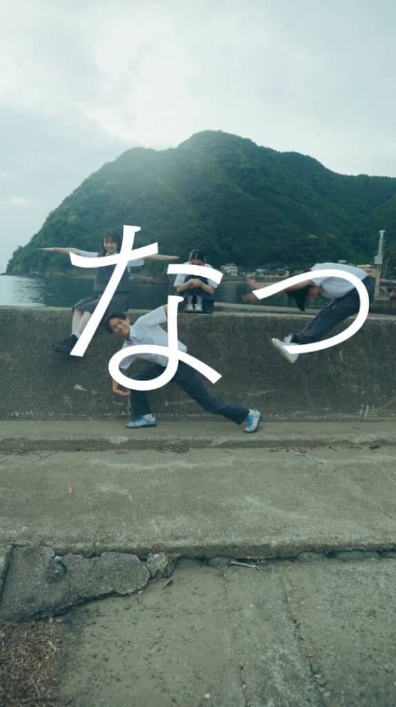 動画では、4人が海辺で何やらポーズを取っています。1人がジャンプして、身体を大きく曲げたところで画面はストップ。そこで4人が自身の身体を使って「なつ」の文字を表現していると分かるのでした。