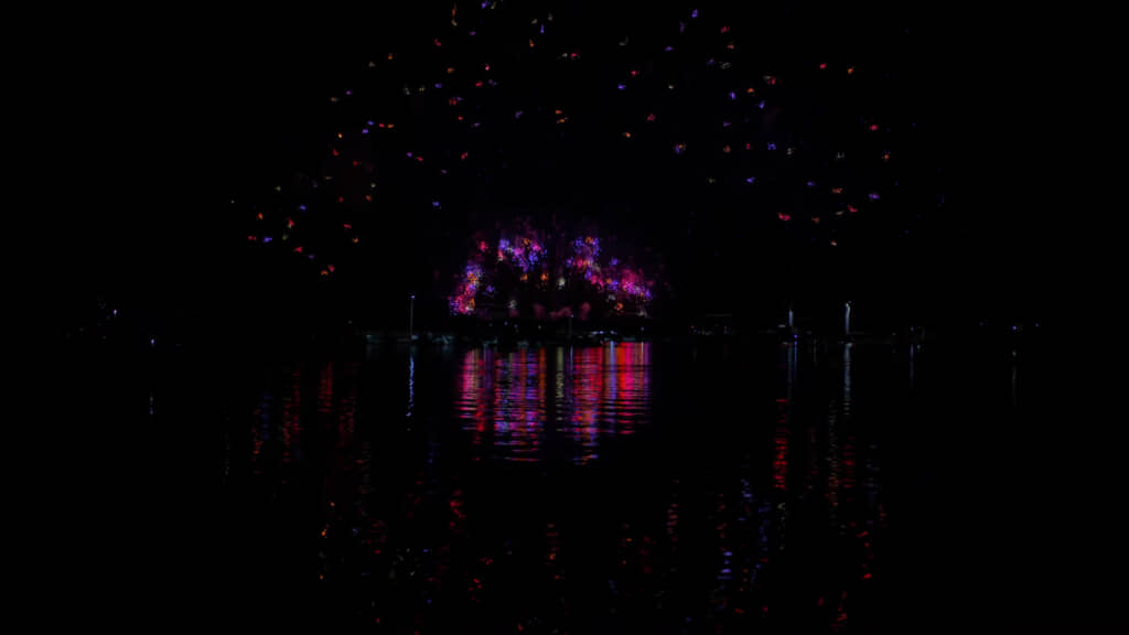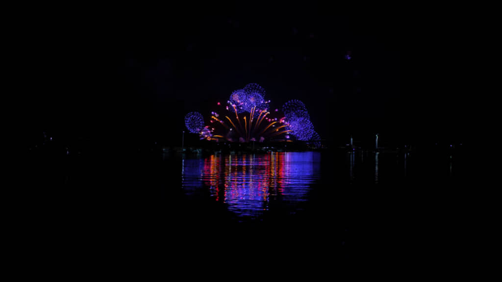 動画では、扇状の花火が打ちあがったあと、カラフルで小さな花火が無数に広がる様子が。ただでさえ美しいのですが、その光が赤羽川の水面に反射することで、一層幻想的な雰囲気を生み出しています。まるで万華鏡みたい……!
