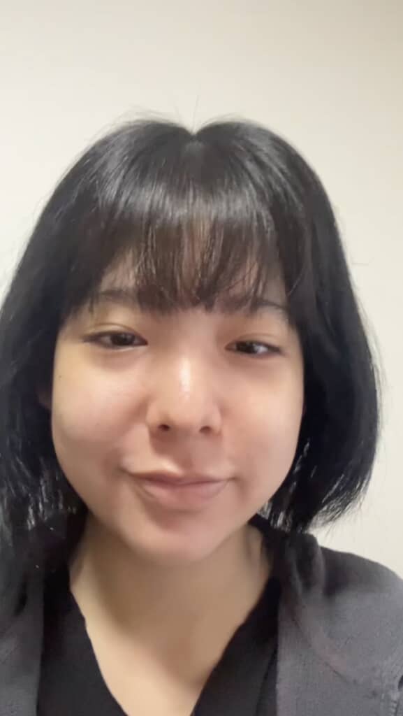 赤みのある涙袋とピンクのリップがマッチしていて、垢抜け感は抜群。グレー系のカラコンも顔全体の雰囲気にぴったりです。メイクでこんなに変わるとは……!