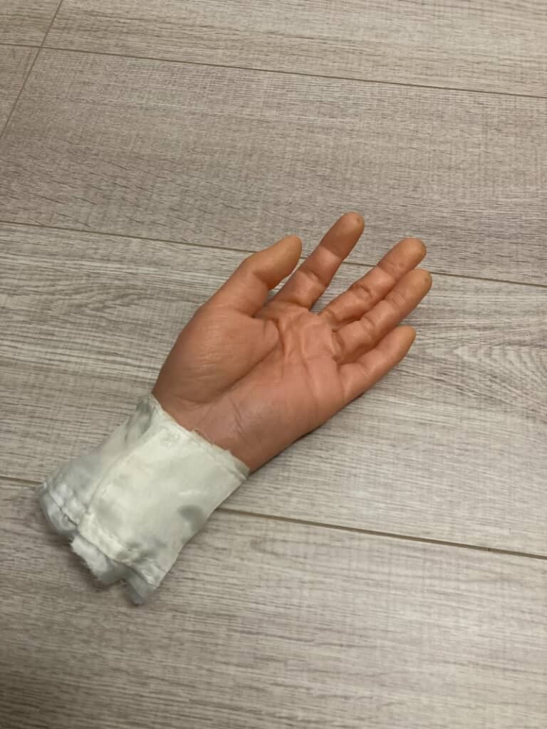 それはなんと作り物の「手」。 20年以上前、長男くんの幼稚園で行われたハロウィンの仮装のために東急ハンズのパーティーグッズコーナーで買ったというおもちゃの手です。これを肩に縫い付けた衣装を作ったところ、先生から「これは……」と躊躇されてしまい許可されなかったといいます。ここまでリアルだと、幼稚園の先生が心配してしまった気持ちもわかりますね。