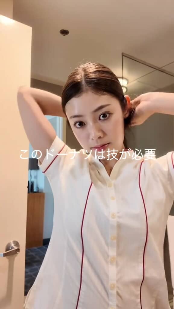 髪が仕上がったら制服に着替え、赤いリップを付けます。このリップについてはコメント欄でたくさん質問が寄せられているのですが、シャネルの「ルージュ アリュール ヴェルヴェット 56」を使っているとのこと。唇に乗せたとたん、全体が引き締まって華やかな印象になり、とてもよく似合っていますね。