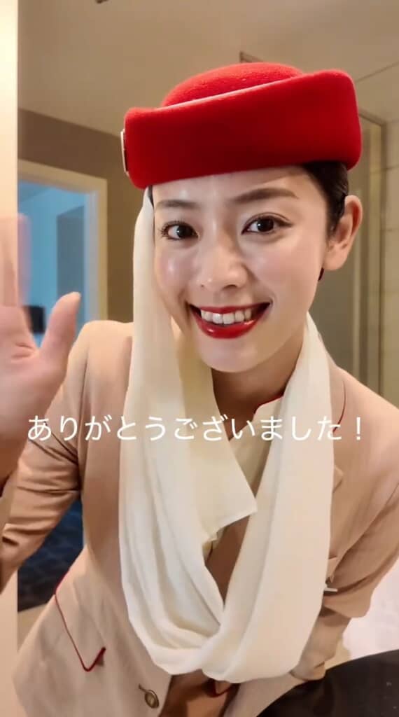 最後に、白いスカーフが付いた赤い帽子を被って、13時間のフライトへ「行ってきます!」。すっかりプロの顔へと大変身しました。このステキな制服は……そう、エミレーツ航空ですね!