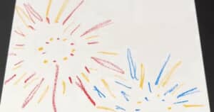 今回のテーマは「花火」。はじめてさんは「線いっぱい描いとけば完成でしょ!」と、紙にクレヨンでラフに線を引いて手早く打ち上げ花火の絵を完成させました。これが花火であることは分かりますが、ごくシンプルで絵としては少し物足りなく見えるかもしれません。