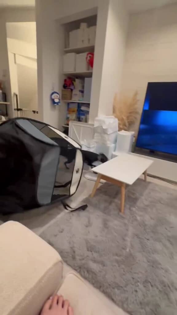 部屋の中を動き回っていたのは、まさかの折りたたみ式のペットハウス(ペットサークル)……! やわらかい素材のハウスがゴロゴロと転がっている様子にびっくりしますが、よく見ると中にワンちゃんがおり、まるでボールの中に入って転がるアトラクションのような楽しみ方をしている姿に笑ってしまいます。その発想はなかった。