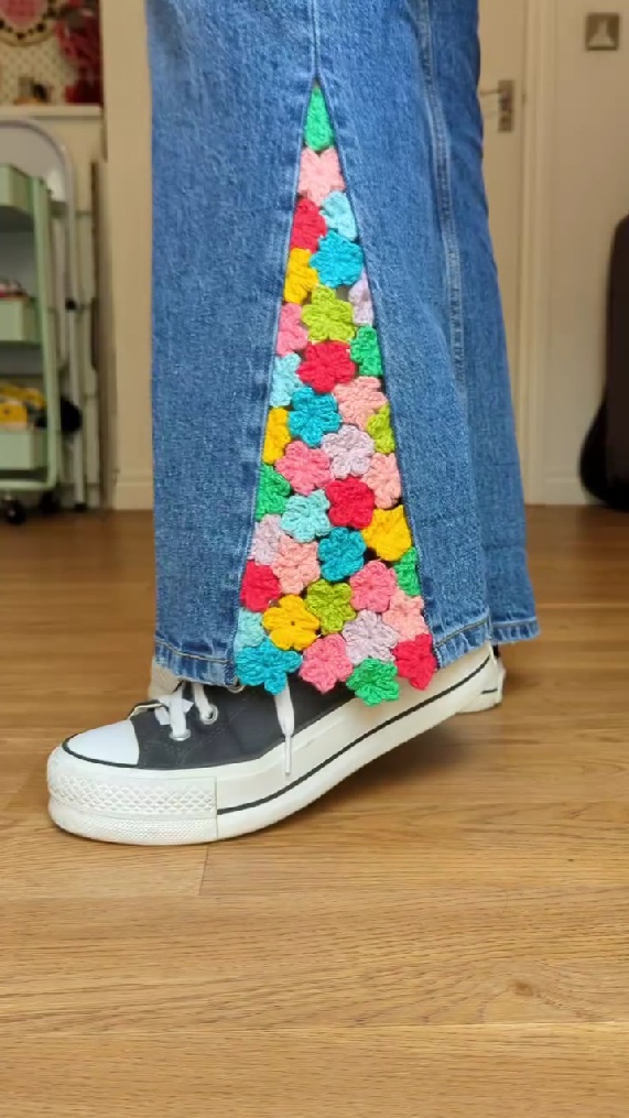かぎ針編みで作ったカラフルな小花モチーフとデニムのジーンズを組み合わせると……? 印象がガラッと変わる驚きのリメイク動画がInstagramで注目を集めています。動画は記事執筆時点で再生数1124万回を突破し、40万8000件以上の“いいね”が寄せられました。これは試してみたい……!