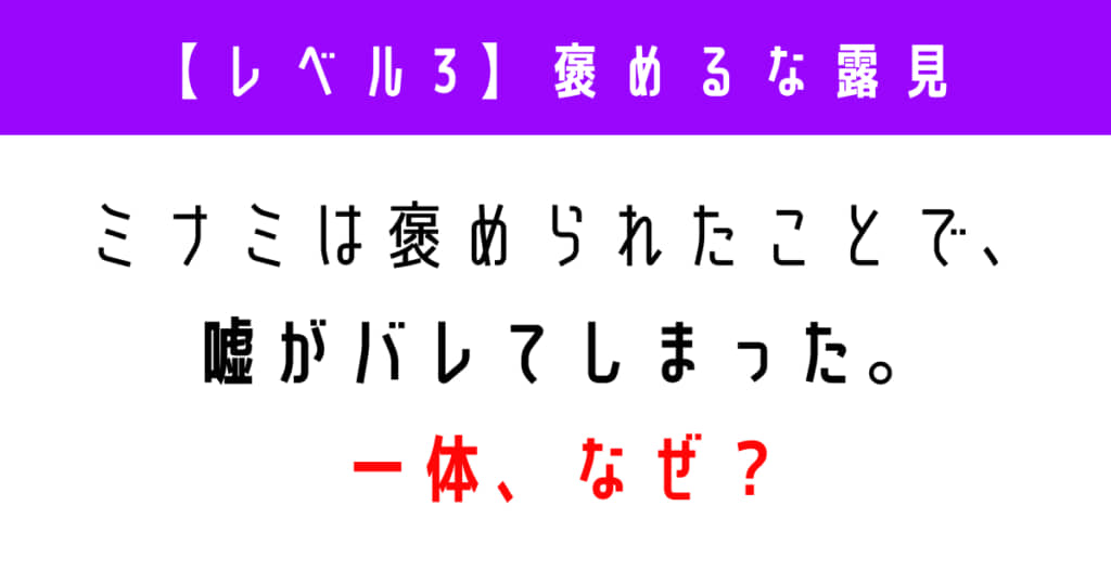 ミナミは褒められたことで、嘘がバレてしまった。一体、なぜ? 「ウミガメのスープ」クイズに挑戦!【レベル3】