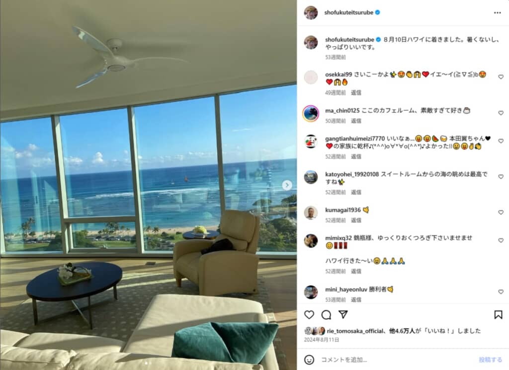 鶴瓶さんがハワイに自宅を所有していることは多くの芸能人に知られており、2025年2月のバラエティー番組出演時には、前面ガラス張りでセンスのいいソファを揃えたリビングに、余裕あるバルコニーも備えた自宅の様子を公開。