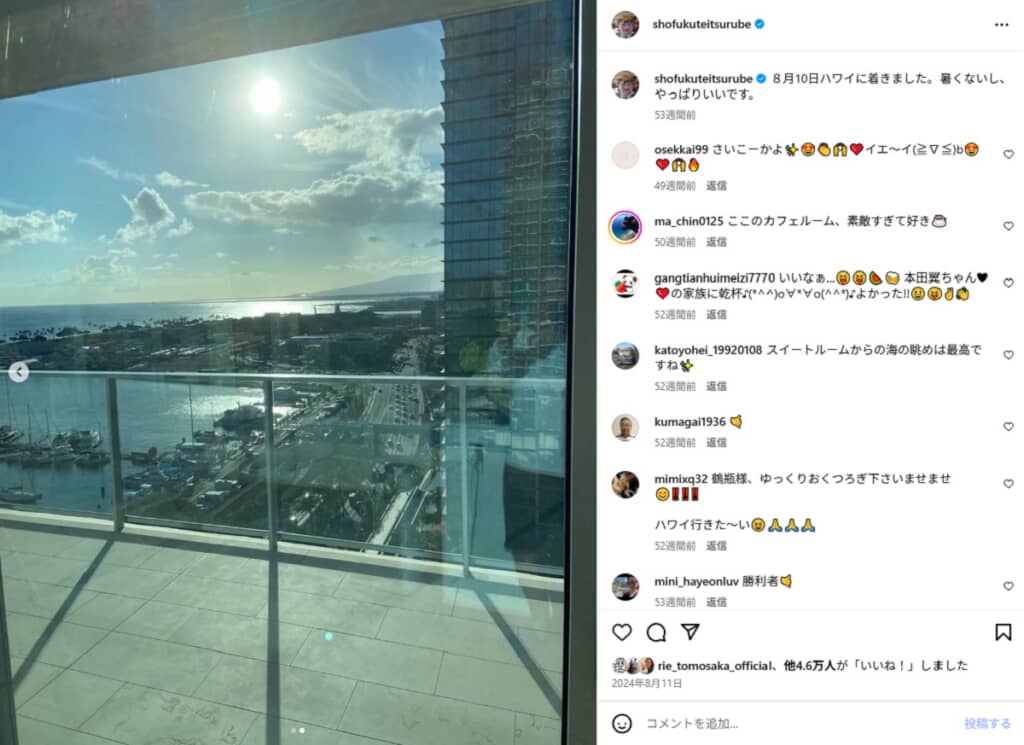 楽しげな集合ショット撮影から5日たった8月20日には、「家から見えるダイヤモンドヘッド、今日も快晴ハワイ最高です」という言葉に添えて、現地名物の火山「ダイヤモンドヘッド」を中心に、どこまでも広がる美しい空と海、緑豊かなスポットを自宅バルコニーから捉えた写真を掲載していました。
