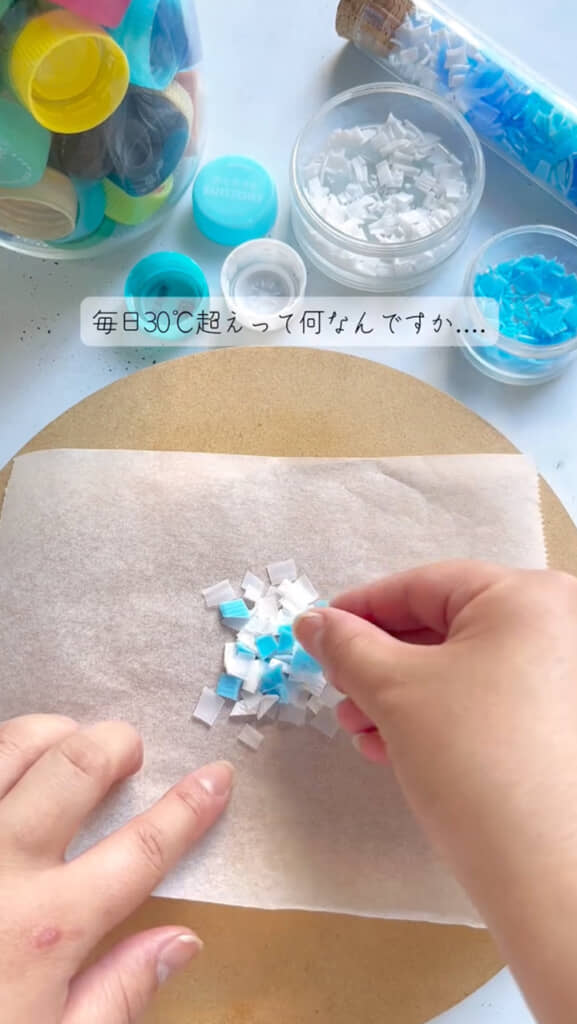 細かく切った水色と白のペットボトルキャップ