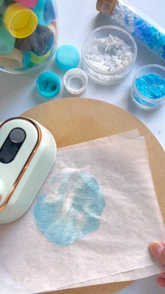 まず、クッキングシートの上に細かく切り刻んでおいた水色と白のペットボトルキャップを適量広げておきます。その上からクッキングペーパーを被せてアイロンを押し当て、薄くのばしてペラペラのシート状にしました。同じ作業を繰り返すと、白と青のグラデーションが美しいマーブル模様のプラ板が何枚も出来ています。この時点でもうきれい!