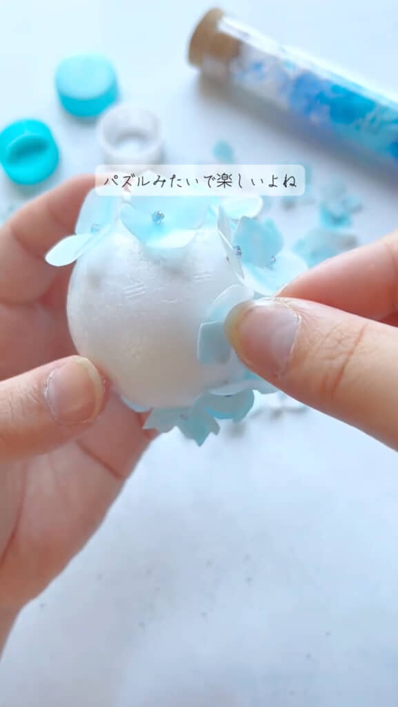 最後に、丸い発泡スチロールのボールを取り出し、そこにあじさいの花をどんどん刺していくと……涼しげなあじさいのフラワーボールが完成! ちょっとしたスペースにかけてお部屋のアクセントになる、すてきなインテリアアイテムが完成しました。とてもペットボトルキャップで作ったとは思えないほどの仕上がりに驚きます。