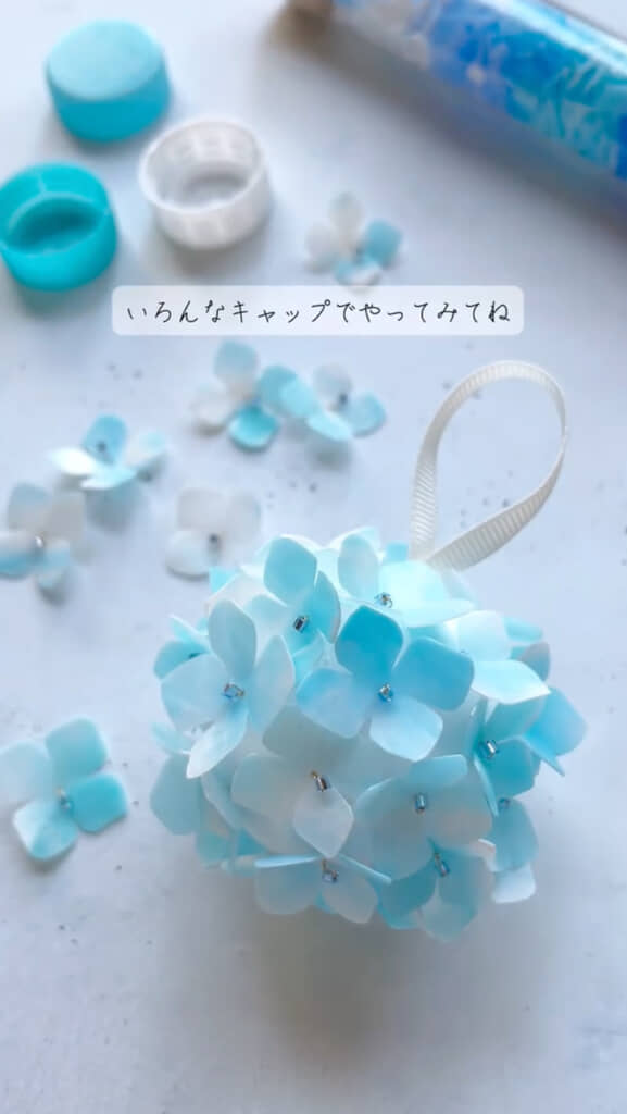 今回注目を集めているのは、水色と白色のペットボトルキャップで「あじさいのフラワーボール」を作る動画です。