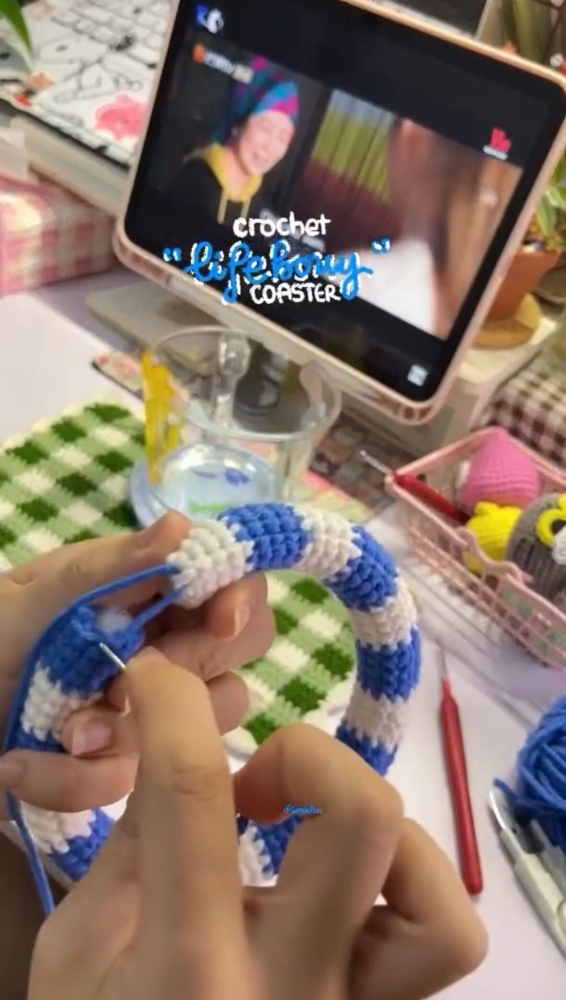 今回紹介するのは、投稿者さんが愛用しているマグカップがぴったり収まる「手編みコースター」を編む動画です。コースターはまるで浮き輪やプールのような見た目が愛らしいだけでなく、安定感も抜群な工夫がされています。