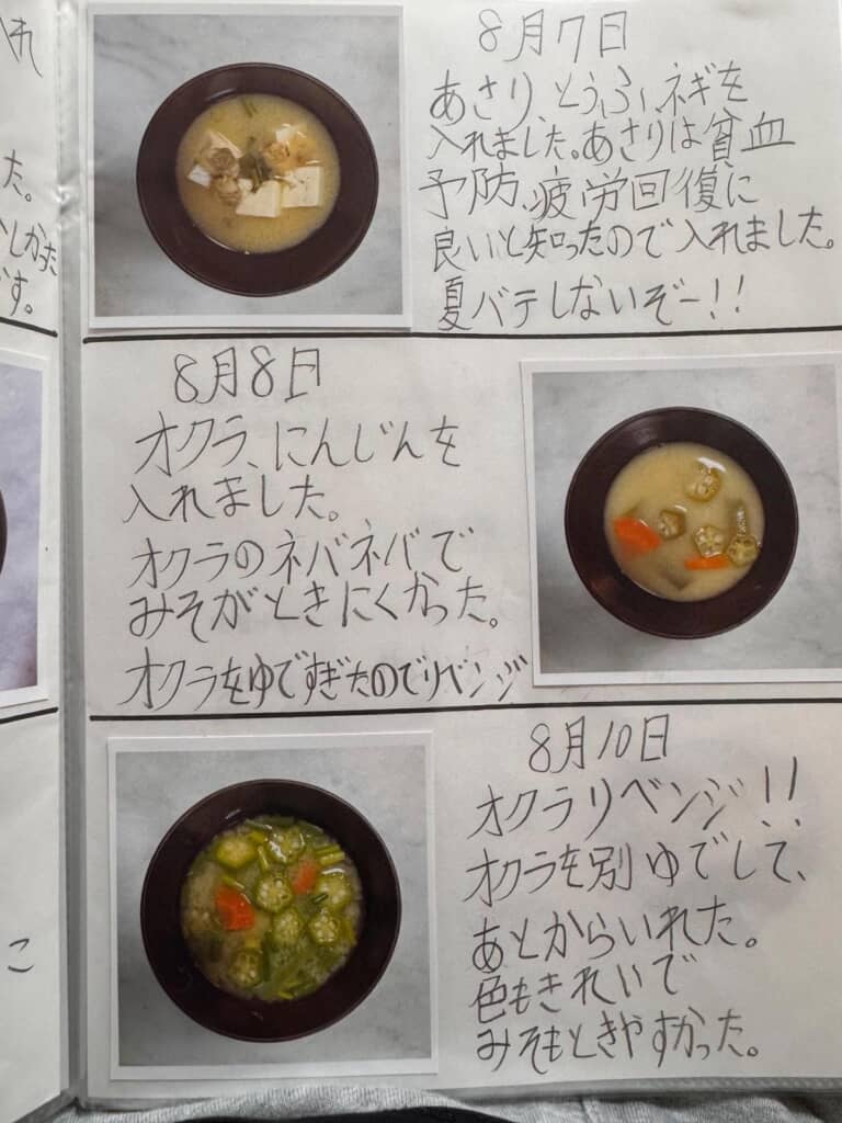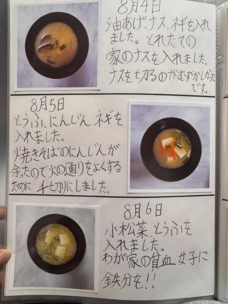 次のページからは毎日作ったみそ汁が写真とともに掲載されています。使用した具材のほか、作ったときに感じたこともまとめられています。8月4日には油揚げとナスにネギ、8月5日には豆腐とにんじんとネギなど、毎日違った食材を使って作る手の込みよう。