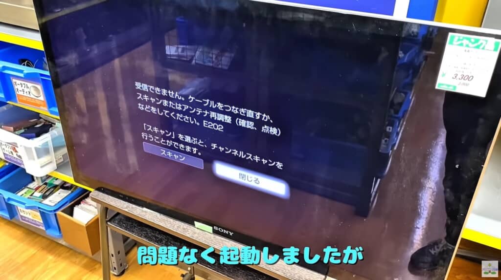 今回は、ハードオフでSONYのBRAVIA(税込み3300円)を購入。問題なく起動し、リモコンによる操作も可能ですが画面のあちこちが不自然に白くなっています。