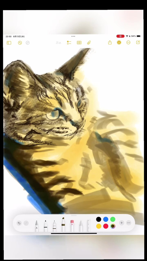 そして……猫のイラストができあがりました! 人に抱きかかえられているような姿勢で、のんびりたたずむ猫。毛の一本一本が浮き上がるようなタッチで表現されており、生き生きとした見た目。メモアプリで1時間の落書きでこの仕上がりとは、信じられません。