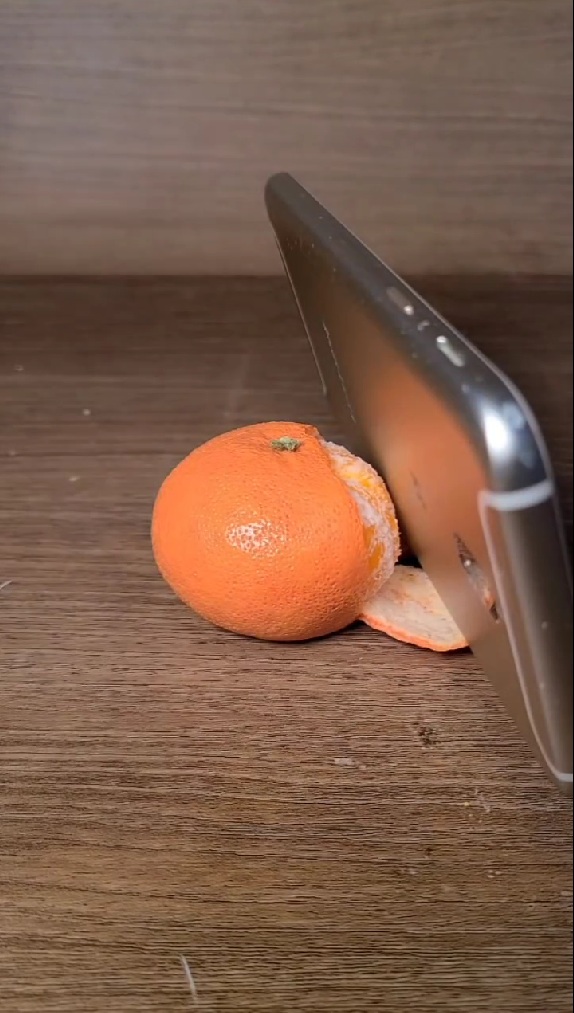 しかし次の瞬間、なんと投稿者さんはみかんを食べずに皮の部分にスマートフォンを立てかけてしまいました。……いったいどういうこと!?