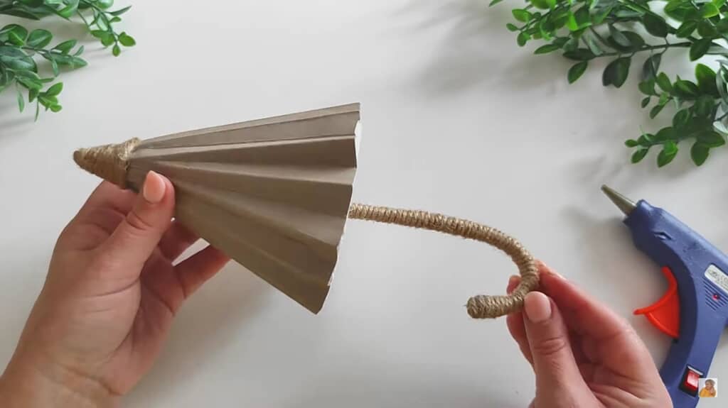 次に円すい状の先端(コーンの先端)に麻ひもをくるくる巻いてグルーで固定。あわせて、カバー付きワイヤーに麻ひもをきつめに巻き付けて柄(え)を作り、軽く曲げてカーブを整えます。これを先ほどの発泡スチロールに差し込めば、傘のシルエットが立ち上がりました。