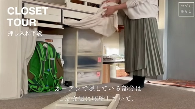 さらに無印良品の「ポリエステル麻 ソフトボックス 衣装ケース 大」2つにタオルケットを収納しており(動画は夏の前に公開されたもの)、夏にはブランケットを入れるそうです。