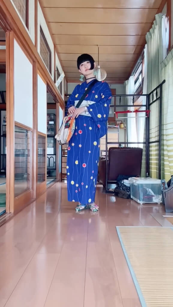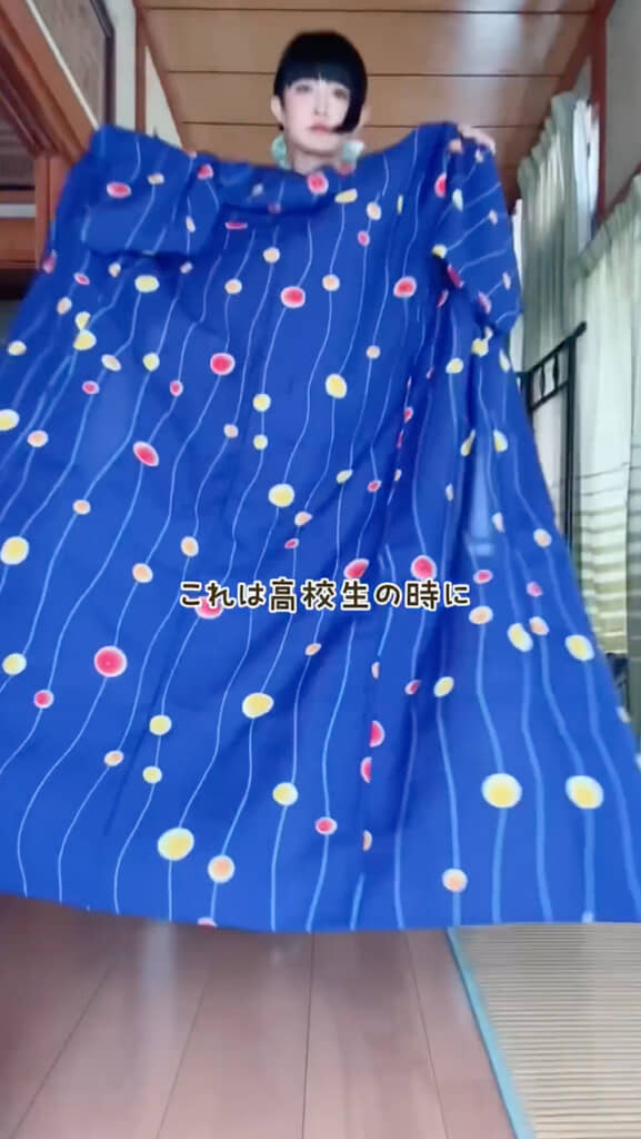 今回は実家に帰省し、タンスに眠っていた浴衣を着てお出かけすることに。取り出したのは、高校生の時にお母さんが縫ってくれたという青地にピンクや黄色の丸模様が入ったレトロな浴衣です。なんとこちら20年以上前のものなのだとか。