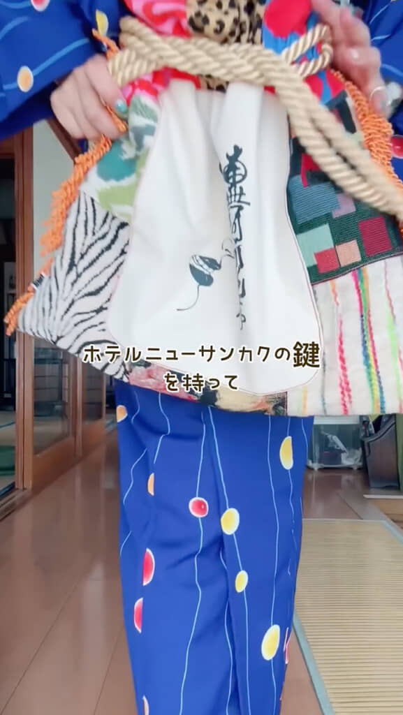 そして最後に、ホテルニューサンカクの鍵と「村門」の巾着フリンジバックを持ったら……ポップな浴衣コーデが完成! 大きなイヤリングやげたも青系でまとめており、涼しげでとってもキュート。20年前に作られた浴衣とは思えないほど、おしゃれに仕上がりましたね。