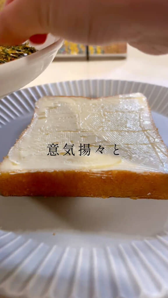 気になったら試さずにいられないkikoさんは、早速パンにマヨネーズを塗り広げ、のりたまで“クリムト模様”を描いてみることに。ただ、小さなのりたまを一つ一つ並べていく作業は途方もなく、開始6秒で絶望……。軽い気持ちで始めたのにと少々後悔したそうです。