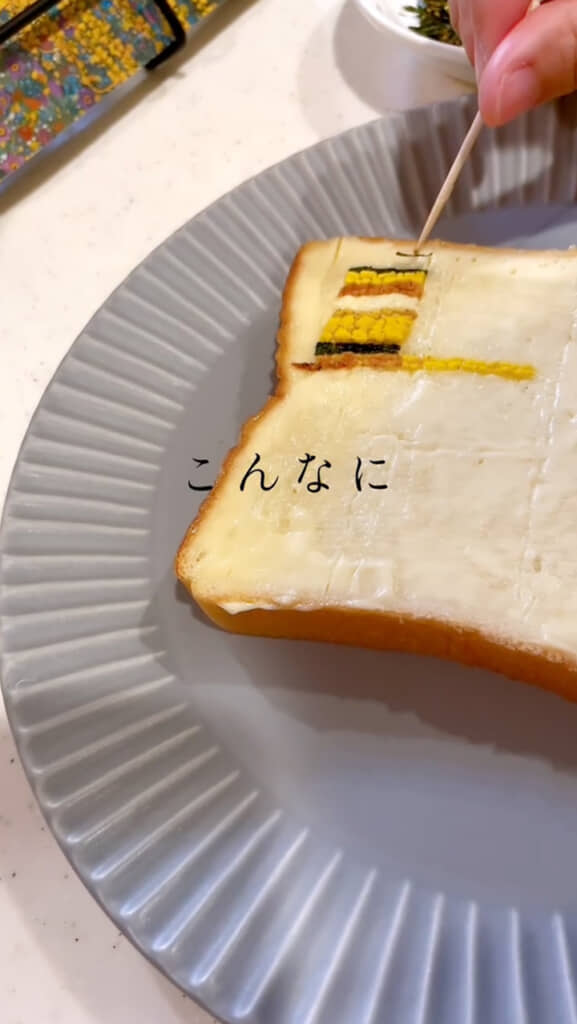 それでも諦めずkikoさんは、のりやたまご、ゴマなどを分けてひたすらパンの上に配置。初めは無謀に思えた挑戦ですが、少しずつパンの上にキレイな模様が浮かび上がってきました。