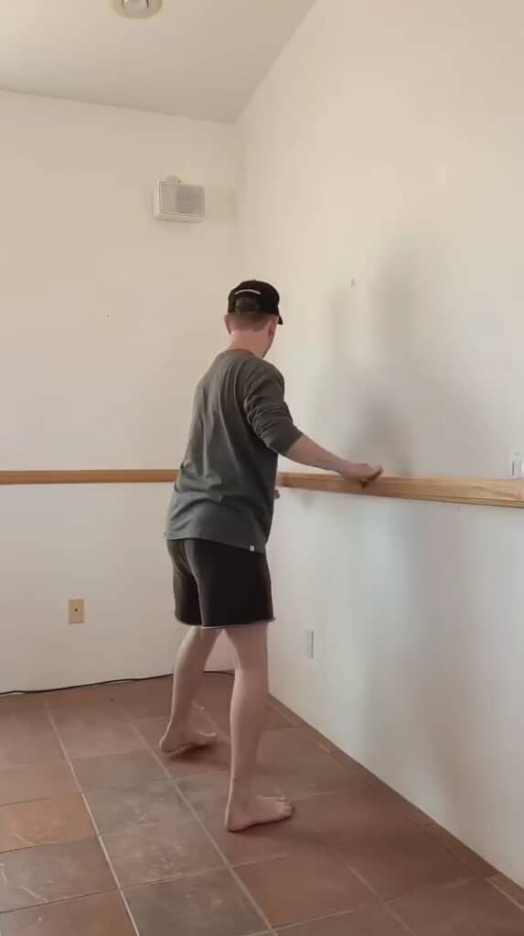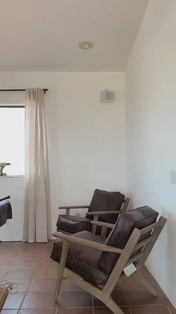 最初の工程は、壁についていた古い木製トリムの撤去。すっきりした壁にカーテンを新調し、穴をペイントで補修して、まるで白紙のキャンバスのように整えていきます。