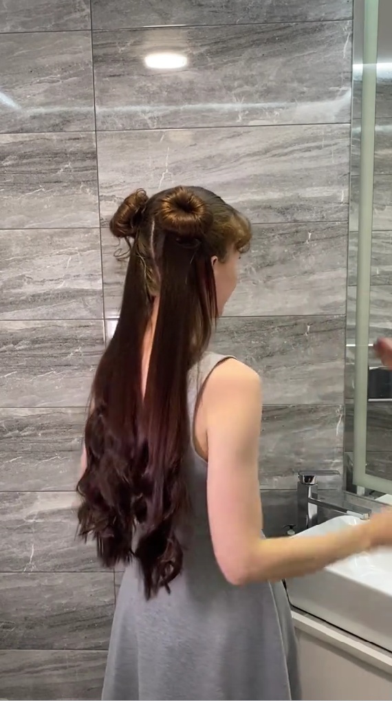 まず髪を真ん中で分け、高めの位置でツインテールにします。そこにお団子ヘアを作るためのドーナツ状ヘアアレンジツールを通し、髪を均等に巻き付けてゴムで固定。余った髪は下におろし、一部を取ってゴムを隠すように巻きつけました。髪にブラシを通すたびにがさらさらと流れる様子が美しい……!