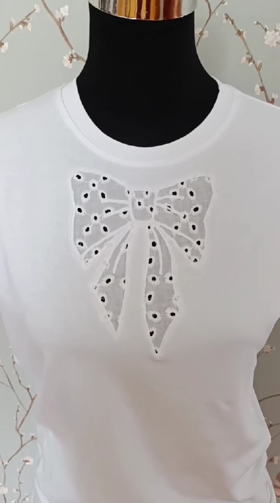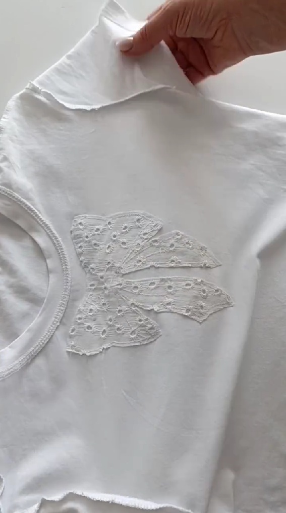 続いて、ミシンで縫い止めた部分の白Tシャツ側を丁寧にカット。余分な布が取り除かれることで、レースの柄が浮かび上がり、美しい透かし模様のある胸元のオリジナルTシャツが完成! シンプルな白Tシャツが、セレクトショップで売られているようなデザインに変身しました。