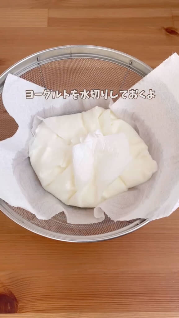 まずは、作る前の下準備から。ボウルとザルの上にキッチンペーパーを敷き、ヨーグルト1パック(400g)を入れて水切りしていきます。このとき、2倍の重さの水を乗せればたったの15分で水切りが完了するそうです。