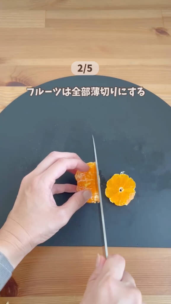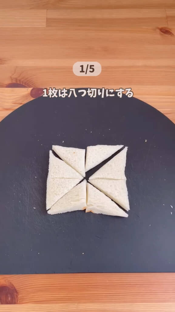 下準備ができたら、食パン2枚分の耳を落とし、1枚だけ八つ切りに。もう1枚はそのまま置いておきます。そして、みかん、いちご、キウイを全て薄切りにし、キッチンペーパーで水分をとっておきます。なお、バナナは中に詰めるため食べやすい大きさでOKとのこと。