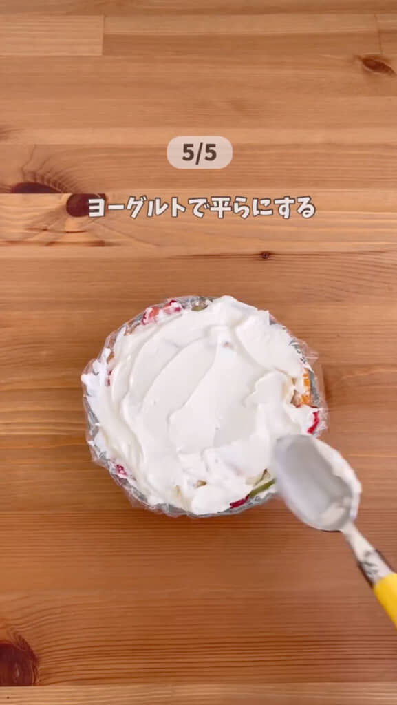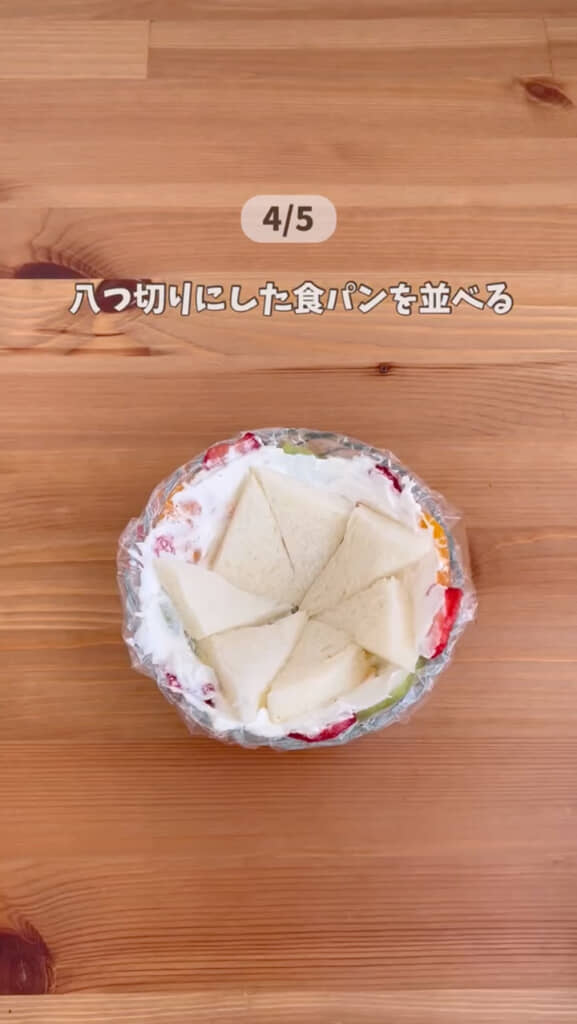 続いて丸いお皿にラップを敷き、カットしたフルーツ、水切りヨーグルト、八つ切りにした食パンの順に重ねていきます。フルーツは、大きいものから並べ、いちごを最後にすると隙間なくキレイに仕上がるそうですよ。すでに美しい……!