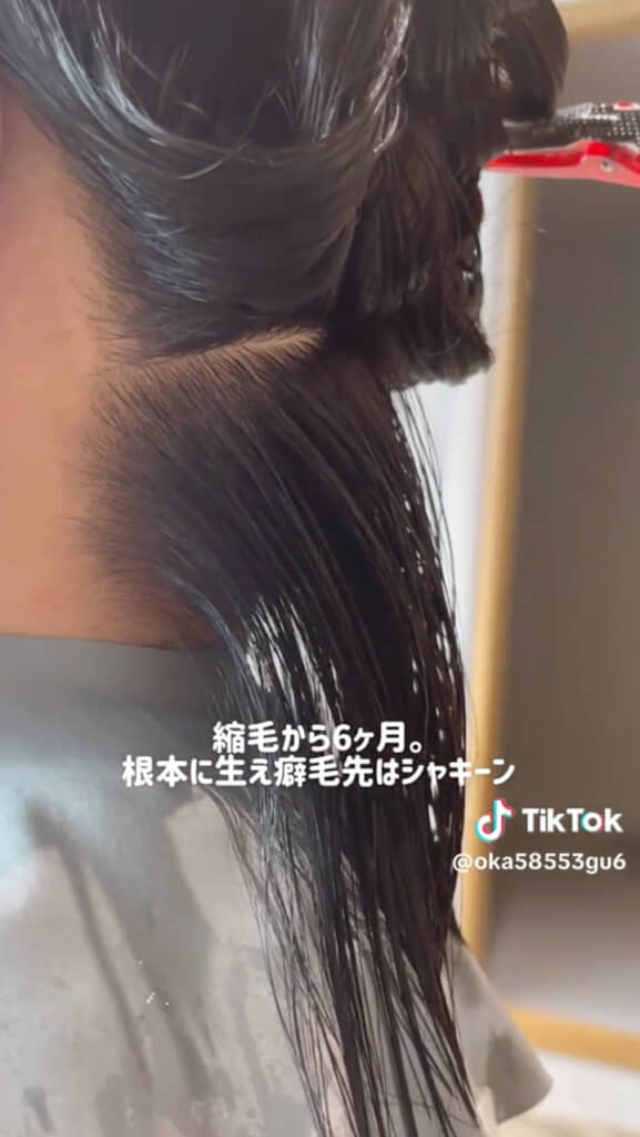 女性は6カ月前に縮毛矯正をかけていたようで、あこさんが髪を確認してみると、根本に生え癖があり毛先がシャキーンと真っ直ぐな状態でした。このままではキレイにまとまらないので、縮毛矯正をかけ直してツヤの出るカラーもすることに。果たしてどのような仕上がりになるのでしょうか?