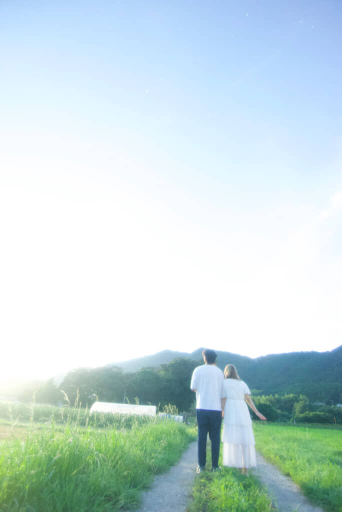 Xユーザーの「ぱ」(@Non_____fiction)さんが投稿した、2枚の写真。1枚目は青空で、自然の風景が写っています。道の真ん中に立っている2人だけでなく、周囲の畑や山などもくっきり。朝か、それとも昼くらいに撮影したのかな? と思ってしまいますが……。