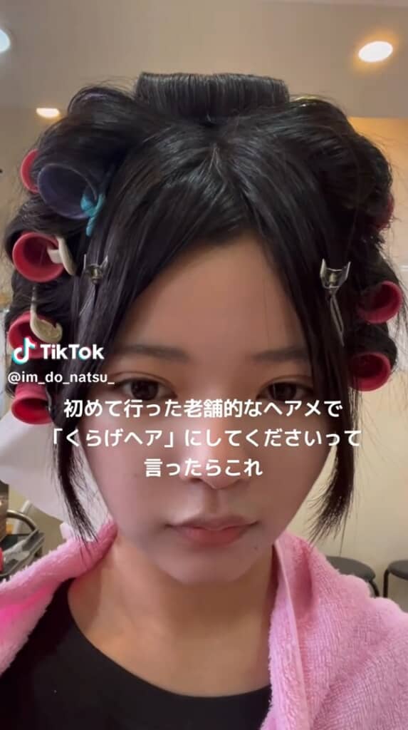 投稿したのは、アイドルグループ「WHITE SCORPION」のメンバーであるNATSUさんのTikTokアカウント・つなとなつ(@im_do_natsu_)さん。冒頭では、カーラーで髪をクルクルに巻かれたちょっと昭和感漂うレトロな姿で登場し、「初めて行った老舗的なヘアメで『くらげヘアにしてください』って言ったらこれ」と説明しました。