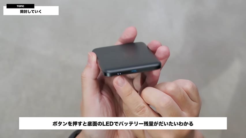 側面のボタンを押すと底面のLEDでバッテリー残量を確認できます