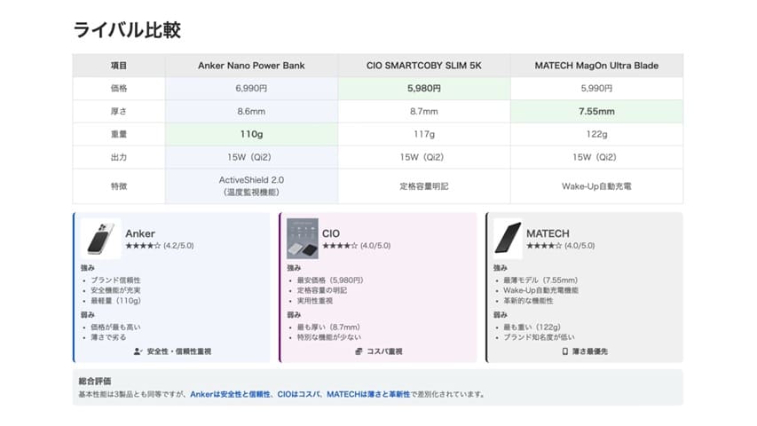 最後に、競合製品のCIO SMARTCOBY SLIM 5K、MATECH MagOn Ultra Bladeの2つと比較すると、値段は競合製品2つのほうが1000円ほど安く、薄さはMATECH MagOn Ultra Bladeが最薄。重量は公式発表に準拠するとAnker Nano Power Bankが最軽量となっています(動画投稿時点の情報による比較)。ただ薄さは、最薄のMATECH MagOn Ultra Bladeと比較しても、側面加工のおかげかそこまで差がないようにも見えるとのことです。