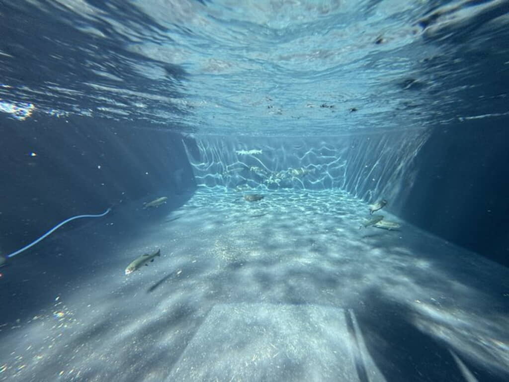 でぶごんさんが考えている完成形は、コンクリートで四方を囲った水族館のような作り。完成するまで待ちきれなくなったでぶごんさんは、ビニールシートを使った巨大プールを組み立て、魚たちの姿を楽しむことにしました。