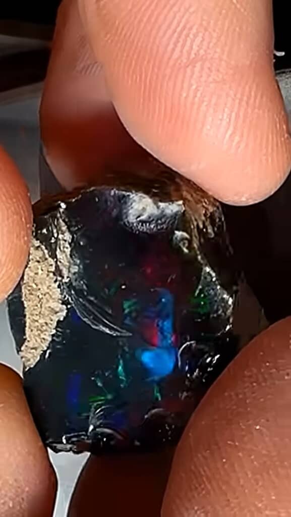 ゴツゴツとした石は、まるで深い海のような群青色のオパールに変身! 緑、青、赤などの色が含まれ、“ブラックオパール”と呼ばれる宝石が姿を現しました。