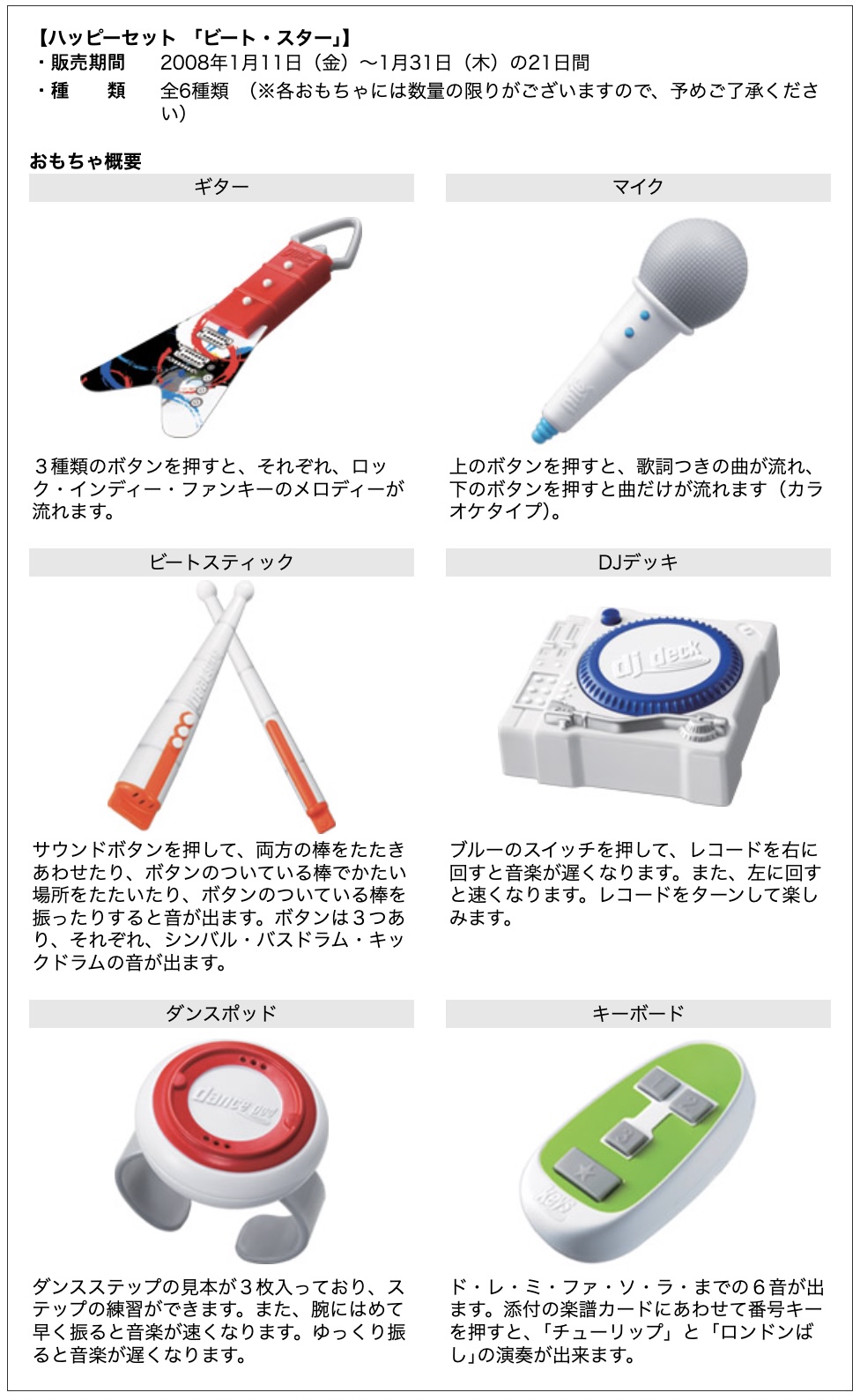 今回紹介するのは、2007年1月に登場したハッピーセットのおもちゃ「ビート・スター」です。
