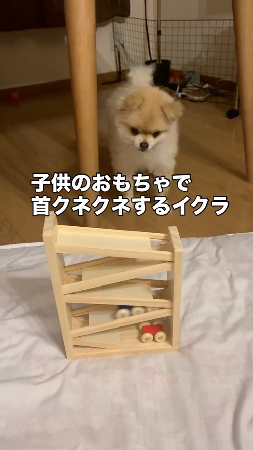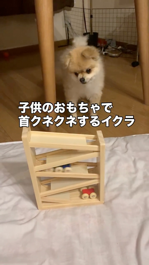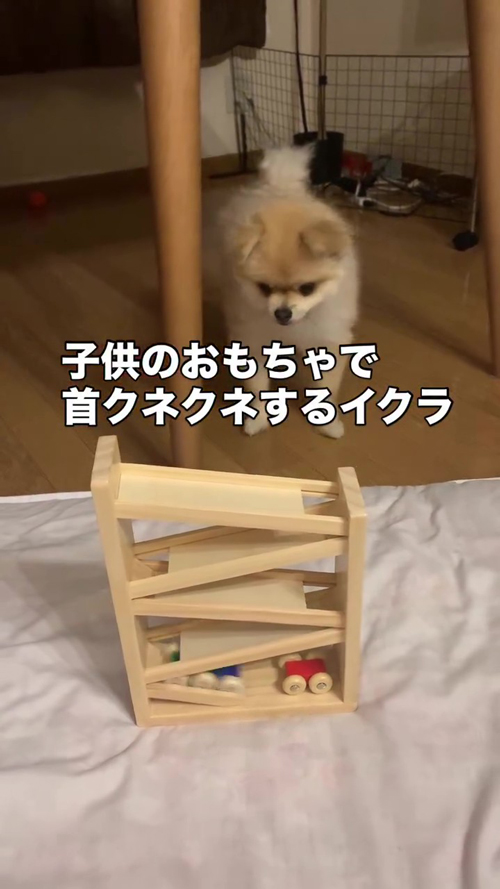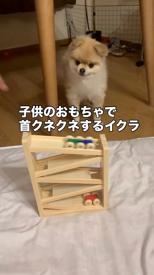 投稿主は、ポメラニアンの「ヒョウ」くんと「イクラ」ちゃんの飼い主(@hyotoikura)さん。「子どものおもちゃで首クネクネするイクラ」と題して、くるくるスロープを目の前で見たイクラちゃんの反応を紹介しています。