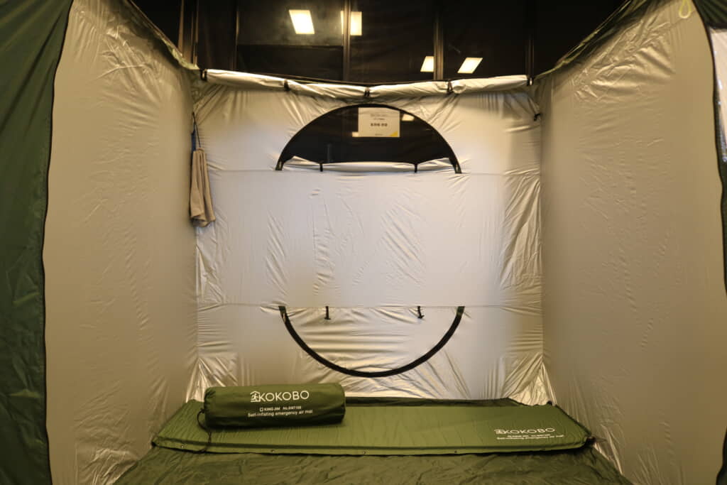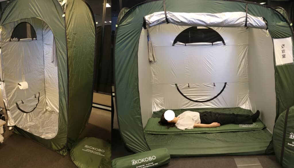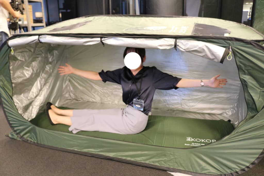 1人用の休息スポットとして、あるいは集団避難での更衣室やお手洗いスポットなどとして利用できる小型テント、家族やグループでゆったり休息できる大型テント。どちらにも違った使い方があり「防災テント」のメリットを考えるきっかけになりました。