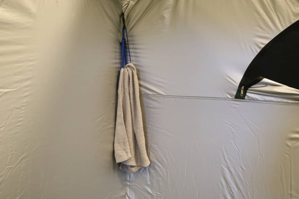 また、テントの内側にはトイレットペッパーやタオルなどをかけられるホルダー・フックが、外側にはA4の紙を入れられる透明ポケットが付いていました。キャンプ用テントとは異なる機能、防災テントとして「こんな場面で役立ちそうだな」と思えるような機能がたくさんついている点が好印象でした。
