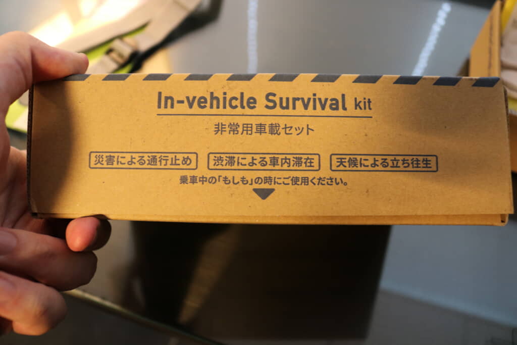 外箱には大きく「非常用車載背セット」と書いてあるほか、車載セットの利用シーンとして「災害による通行止め」「渋滞による車内滞在」「天候による立ち往生」など、乗車中の「もしも」の時に使えると書かれています。これなら、車載セットを準備した張本人以外がこの箱を見つけても、この箱が何なのかすぐ分かりますね。