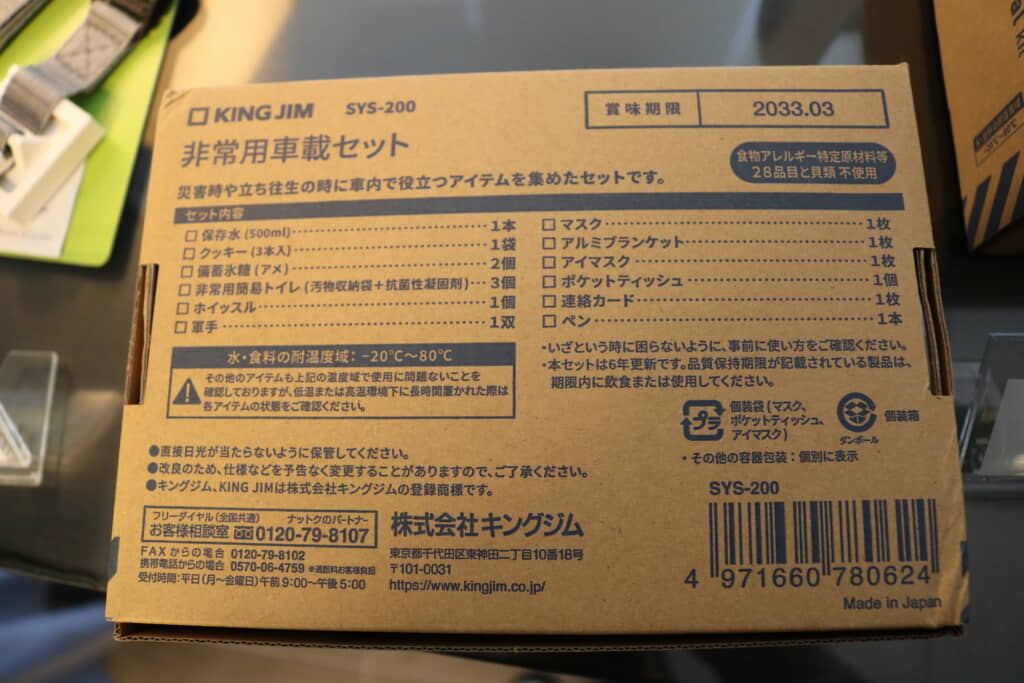 また、食べものや飲み物を保管するとなると、車内の温度環境を気にされる方もいるのではないでしょうか。この非常用車載セットに含まれる飲食物は「マイナス20度から80度まで」の温度環境に耐えられるそうです! なので非常時には安心して飲食できます。