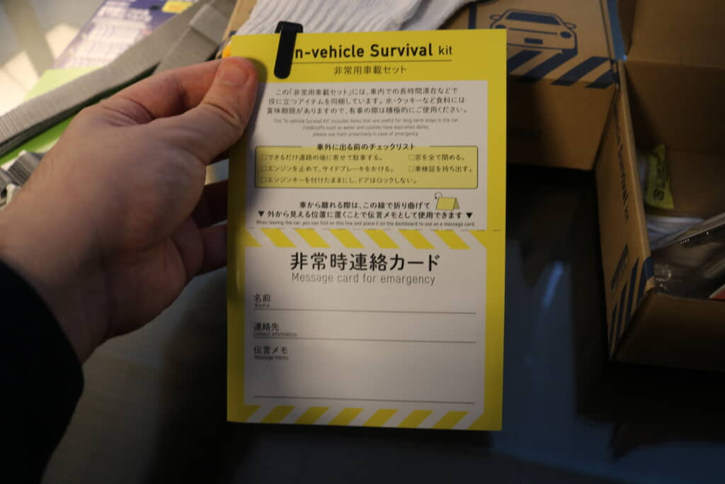 個人的に便利に感じたアイテムは連絡カード。表面には車を離れる際に伝言メモとして代用できる非常時連絡カードが、裏面には非常用車載セットの内容一覧と災害時に役立つ情報が記載されています。