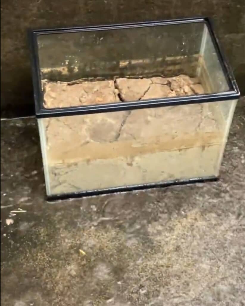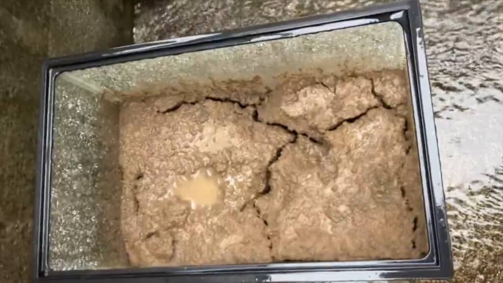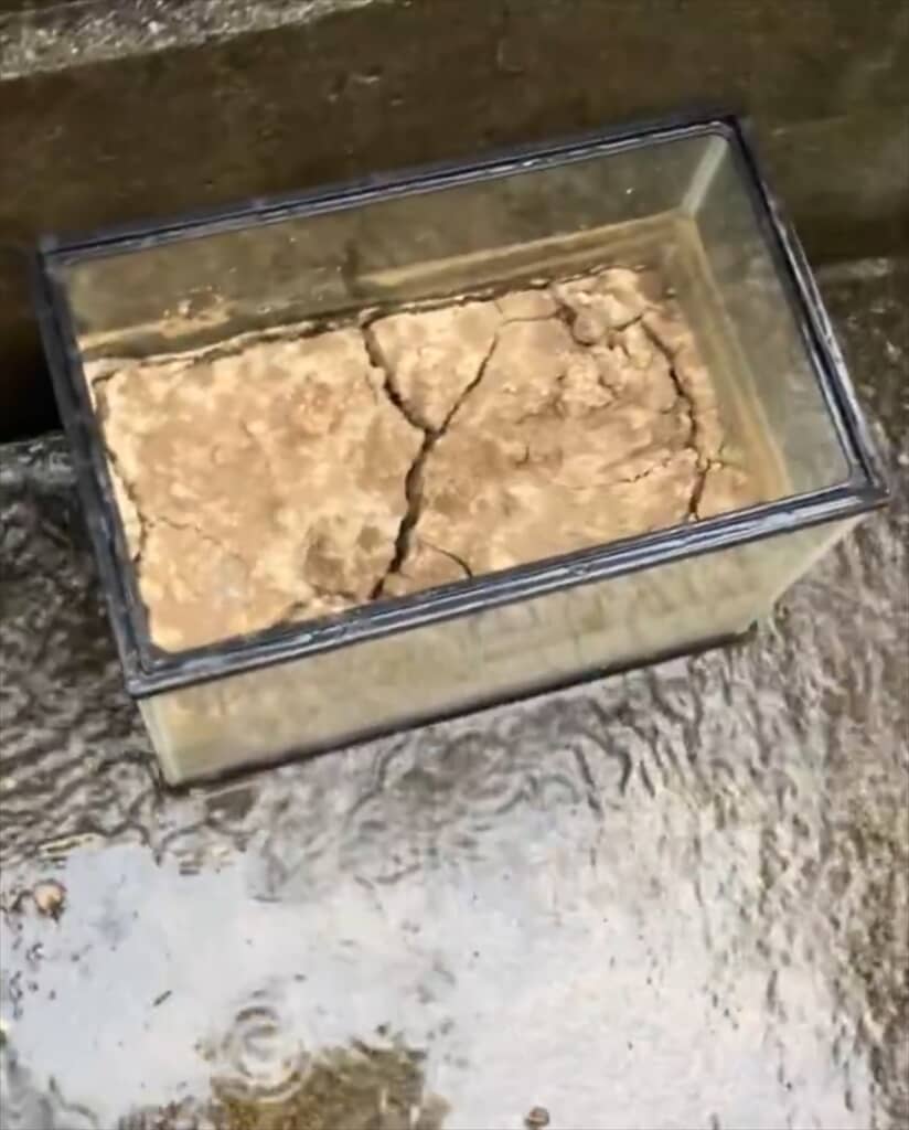 今回の投稿では、「5カ月間、室内で放置し、完全にカラカラに乾いた、水気ゼロのヒビ割れた泥土に雷雨が染み込み始めました」と説明文を添えて合計4本の動画を公開。カラカラに干からびた土が入った水槽を、激しい雨が降る屋外に出した様子を撮影しています。