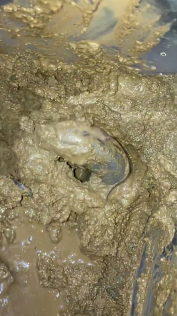 5カ月間も放置されたカラカラの土中で生き延びていた謎の生き物。ドジョウのような見た目をしており、全身の泥を落とされると、危険を察知したのか全身をうならせます。