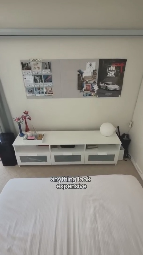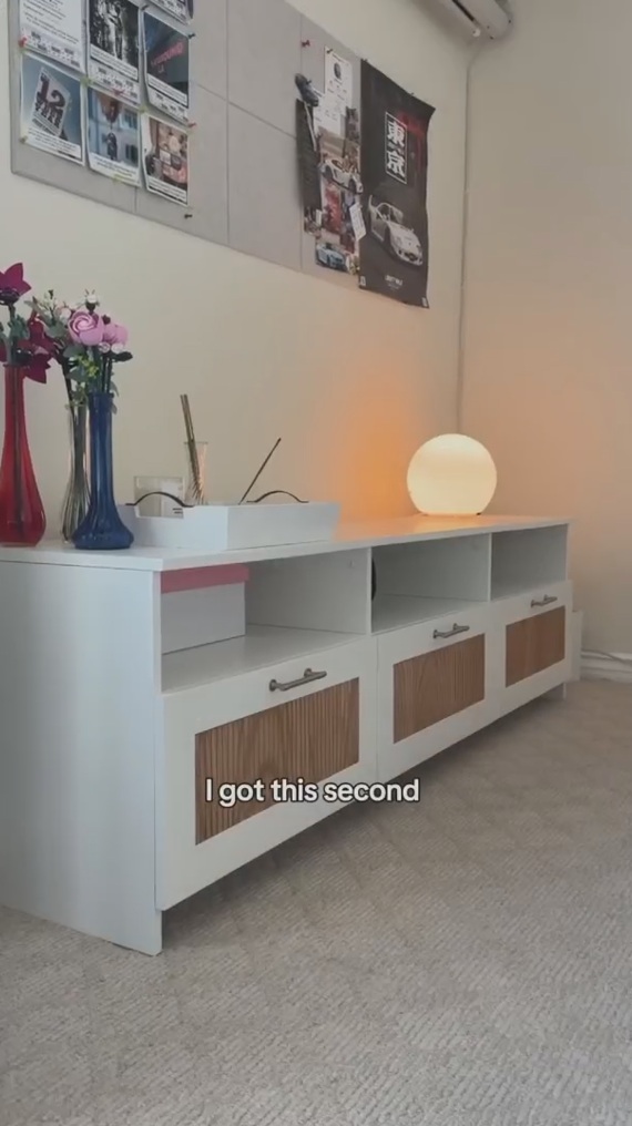 今回紹介するのは、中古で手に入れたIKEAの棚をちょっとした工夫でアップデートした動画です。投稿者さんが手を加えたのは、IKEAの「BRIMNES(ブリムネス)」シリーズのテレビ台。ホワイトで統一された直線的なローボード型のテレビ台で、上段は3分割のオープン棚、下段はすりガラスの窓が付いた引き出しを備えた家具です。